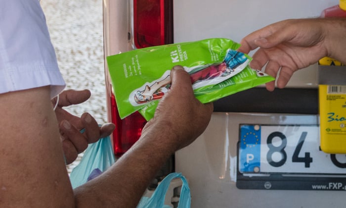 A patient receives syringes from a van parked in Lisbon after taking his daily dose of methadone, part of Portugal’s humane drugs policy. Photograph: Horacio Villalobos/Corbis via Getty Images